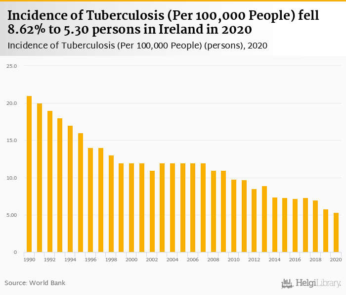 Incidence of tuberculosis per 100,000 people rose 4.55% to 4.60 persons in Ireland in 2023, according to World Bank / WHO.