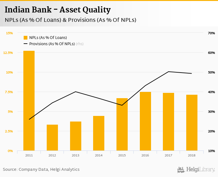 Indian Bank's non-performing loans reached 7.12% of total loans at the end of 2018, down from 7.39% compared to the previous year. Historically, the NPL ratio hit an all time high of 12.7% in 2011 and an all time low of 3.34% in 2012.