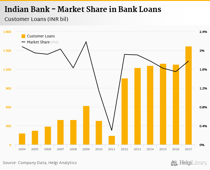 Indian Bank accounted for 1.77% of all customer loans issued in India at the end of 2017. Historically, the bank’s market share in customer loans reached an all time high of 2.18% in 2009 and an all time low of 0.299% in 2011.