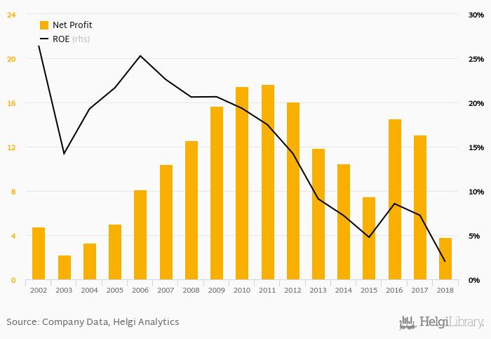 The bank generated its shareholders an average return on equity of 5.95% in the last five years with maximum at 8.56% and minimum at 1.98%