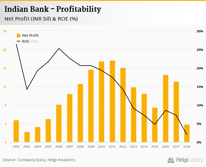 Indian Bank made a net profit of INR 3.80 bil in 2018, down 71.0% compared to the previous year. This implies a return on equity of 1.98%.