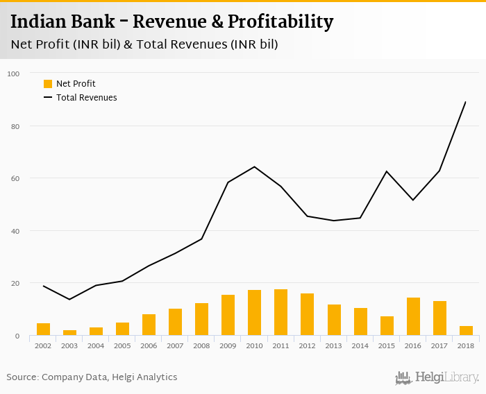Indian Bank made a net profit of INR 3.80 bil under revenues of INR 89.1 bil in 2018, up -71.0% and 42.2% respectively compared to the previous year.