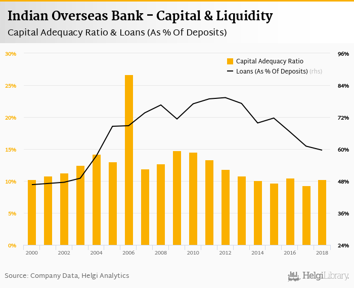 Indian Overseas Bank's capital adequacy ratio reached 10.2% at the end of 2018, up from 9.25% compared to the previous year. Historically, the bank’s capital ratio hit an all time high of 26.7% in 2006 and an all time low of 9.25% in 2017.