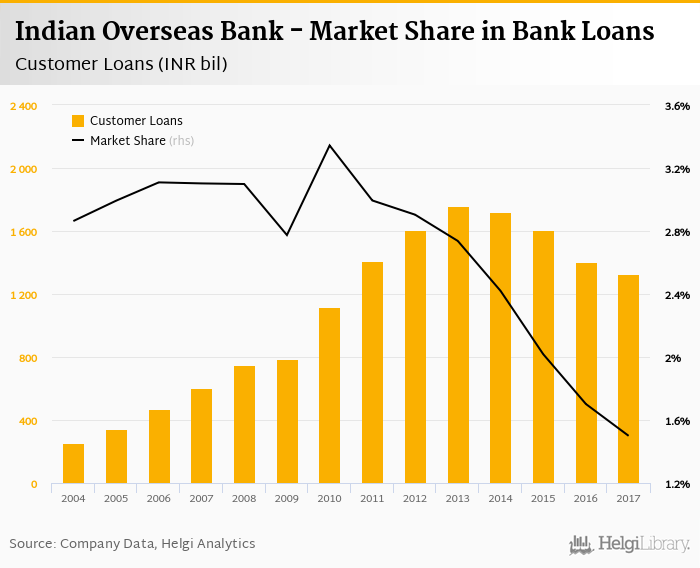 Indian Overseas Bank's customer loans reached INR 1,325 bil in 2017, down 5.67% compared to the previous year.