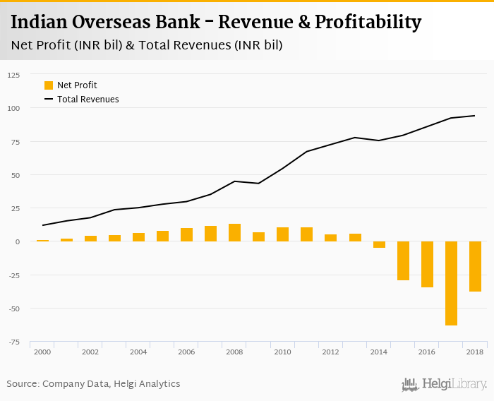 Indian Overseas Bank made a net profit of INR -37.4 bil under revenues of INR 93.8 bil in 2018, up 40.7% and 1.87% respectively compared to the previous year.