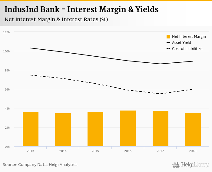IndusInd Bank's net interest margin amounted to 3.54% in 2018, down from 3.75% compared to the previous year.