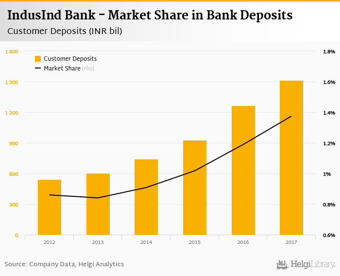 IndusInd Bank's customer deposits reached INR 1,516 bil in 2017, up 19.8% compared to the previous year.