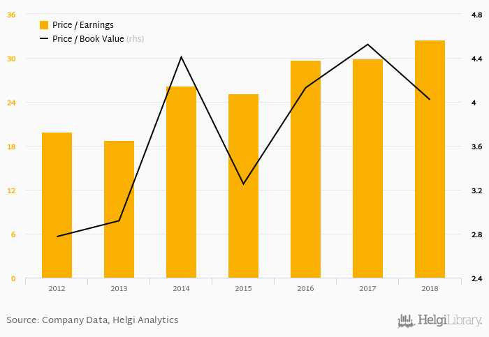 In terms of price to book value, the stock reached 4.02x at the end of 2018. Since 2013, the multiple reached an all time high of 4.52x in 2017 and an all time low of 3.25x in 2015 with an average of 4.07x.