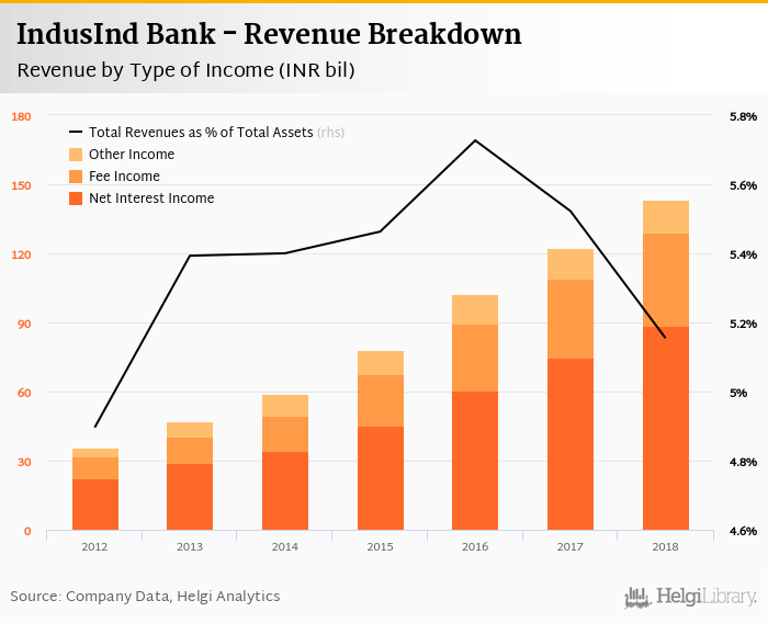 IndusInd Bank generated total banking revenues of INR 143 bil in 2018, up 17% compared to the previous year.