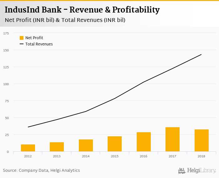IndusInd Bank made a net profit of INR 33.0 bil under revenues of INR 143 bil in 2018, up -8.47% and 17.0% respectively compared to the previous year.