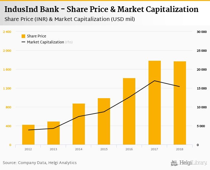 IndusInd Bank stock traded at INR 1,770 per share at the end of 2018 implying a market capitalization of USD 15,371 mil.