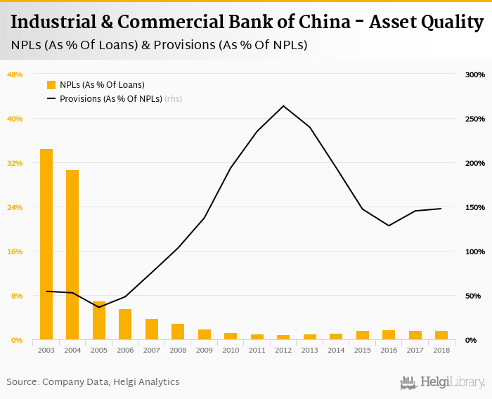 Industrial & Commercial Bank of China's non-performing loans reached 1.64% of total loans at the end of 2018, down from 1.65% compared to the previous year. Historically, the NPL ratio hit an all time high of 34.5% in 2003 and an all time low of 0.950% in 2012.