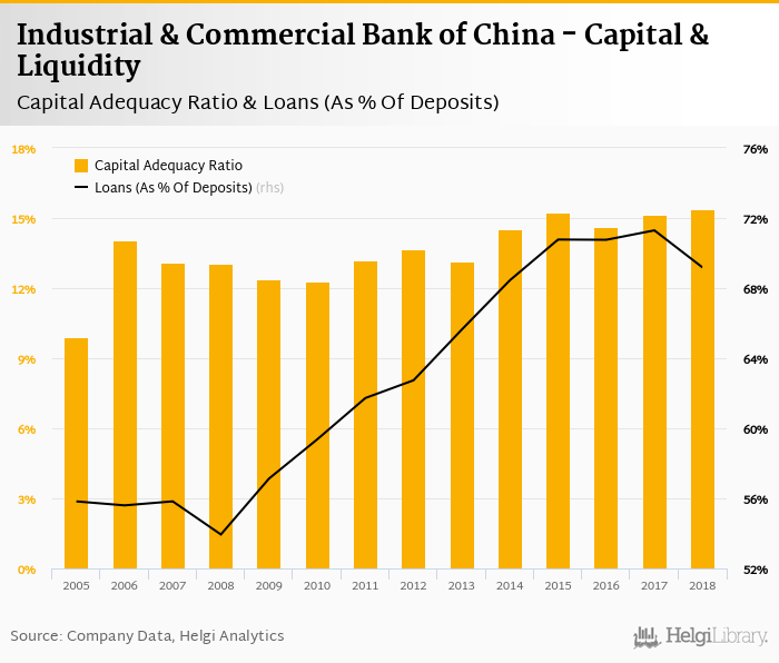 Industrial & Commercial Bank of China's capital adequacy ratio reached 15.4% at the end of 2018, up from 15.1% compared to the previous year. Historically, the bank’s capital ratio hit an all time high of 15.4% in 2018 and an all time low of 9.89% in 2005.