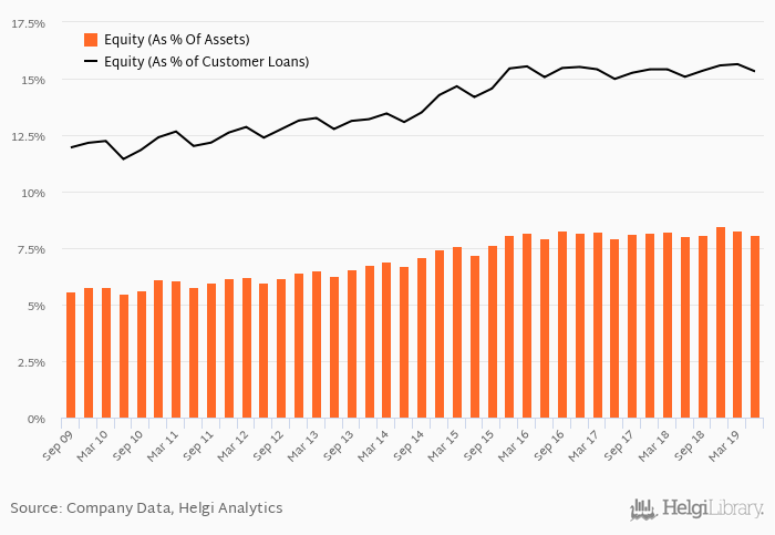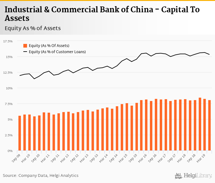 Industrial & Commercial Bank of China's Equity reached 7.25% of total assets in the 2Q2019, up from 7.16% for the previous year. As a share of net customer loans, the ratio amounted to 13.9% at the end of the second quarter of 2019.