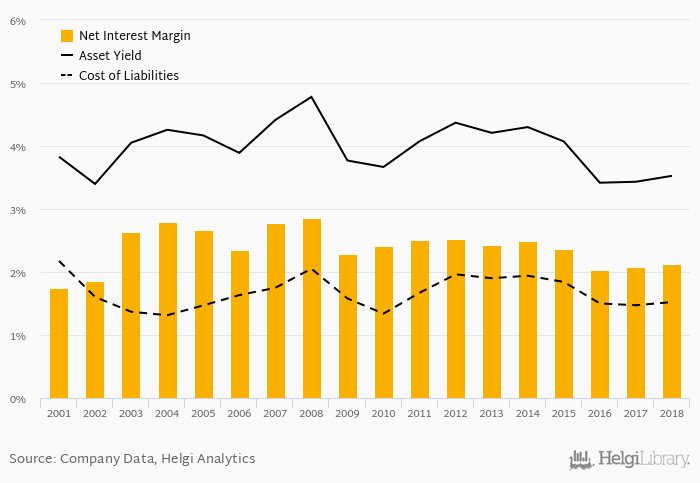 Historically, the bank’s net interest margin reached an all time high of 2.85% in 2008 and an all time low of 1.75% in 2001. The average margin in the last five years amounted to 2.22%.