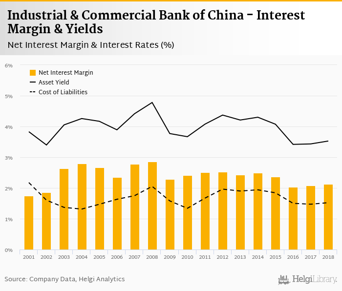 Industrial & Commercial Bank of China's net interest margin amounted to 2.13% in 2018, up from 2.08% compared to the previous year.