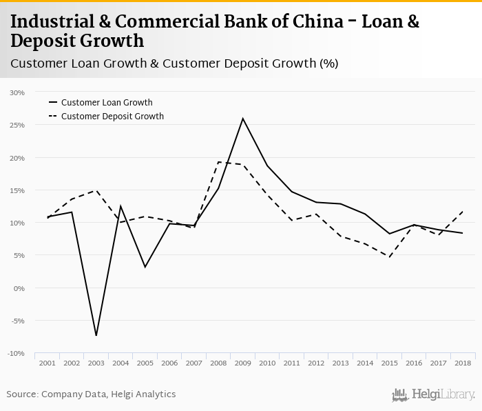 Industrial & Commercial Bank of China's customer loan growth reached 8.30% in 2018, down from 8.82% compared to the previous year. Historically, the bank’s loans growth reached an all time high of 25.9% in 2009 and an all time low of -7.45% in 2003. In the last decade, the average annual loan growth amounted to 13.0%.