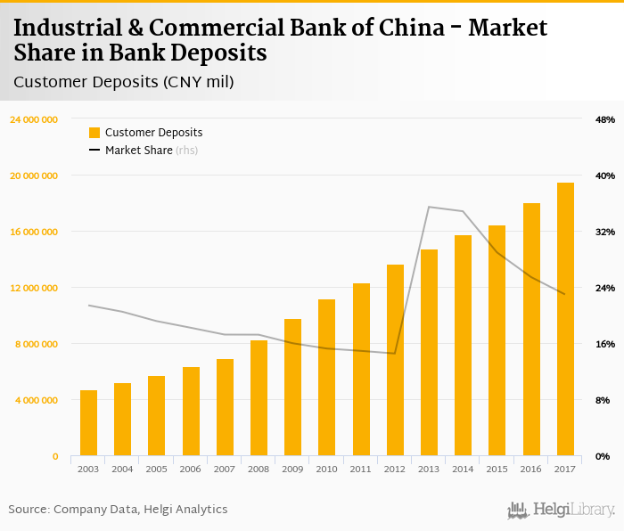 Industrial & Commercial Bank of China accounted for 22.9% of all customer deposits taken by banks in China at the end of 2017. Historically, the bank’s market share in customer deposits reached an all time high of 35.4% in 2013 and an all time low of 14.1% in 2018.