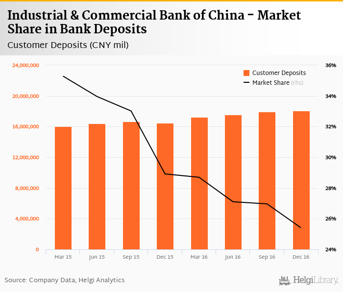 Industrial & Commercial Bank of China accounted for 25.4% of all customer deposits taken by banks in China at the end of 2016-12-31. Historically, the bank’s market share in customer deposits reached an all time high of 35.3% in 2015-03-31 and an all time low of 25.4% in 2016-12-31.