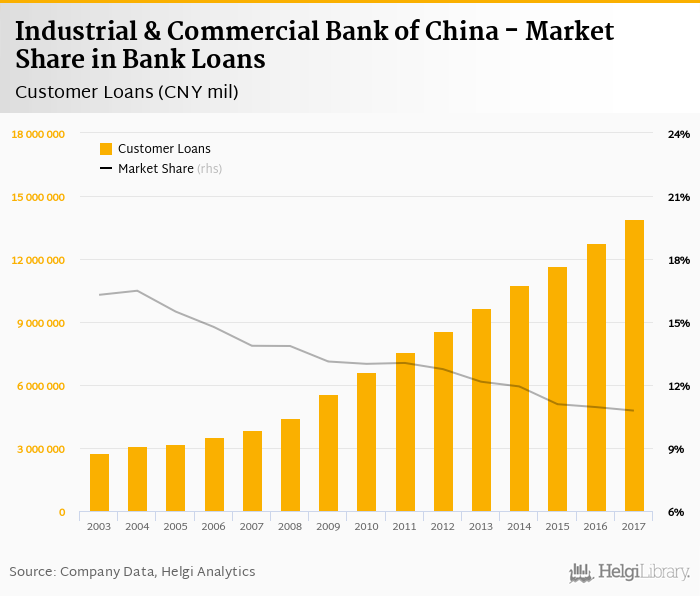 Industrial & Commercial Bank of China accounted for 10.8% of all customer loans issued in China at the end of 2017. Historically, the bank’s market share in customer loans reached an all time high of 16.5% in 2004 and an all time low of 10.4% in 2018.