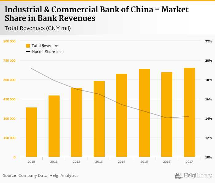 As a result, Industrial & Commercial Bank of China accounted for 14.2% of all bank revenues generated by banks in China in 2017. Historically, the bank’s market share in total revenues reached an all time high of 19.1% in 2010 and an all time low of 14.0% in 2016.