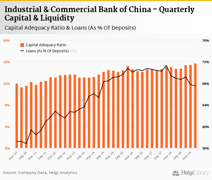 Industrial & Commercial Bank of China's capital adequacy ratio reached 15.8% at the end of second quarter of 2019, up from 15.5% when compared to the previous quarter. Historically, the bank’s capital ratio hit an all time high of 15.8% in 2Q2019 and an all time low of 11.3% in 2Q2010.