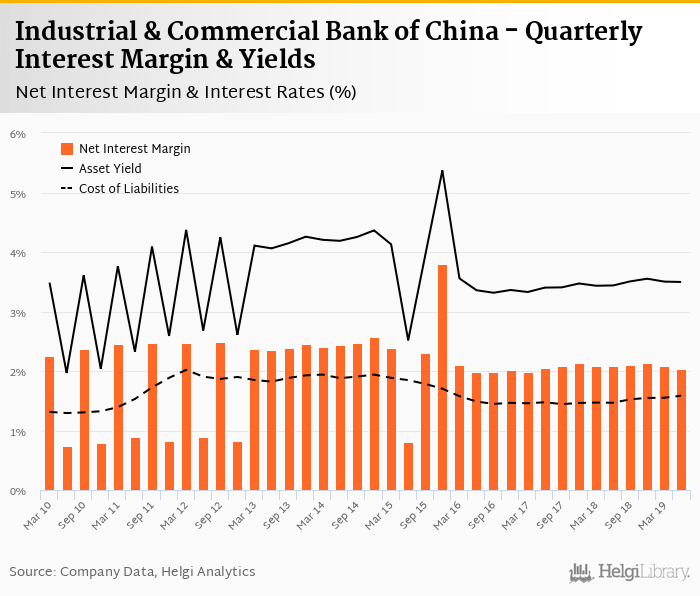 Industrial & Commercial Bank of China's net interest margin amounted to 2.04% in the second quarter of 2019, down from 2.08% when compared to the previous quarter.