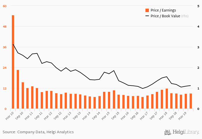 In terms of price to book value, the stock reached 1.12x at the end of 2Q2019. Since the second quarter of 2014, the multiple reached an all time high of 1.84x in 2Q2015 and an all time low of 0.974x in 4Q2016 with an average of 1.29x.