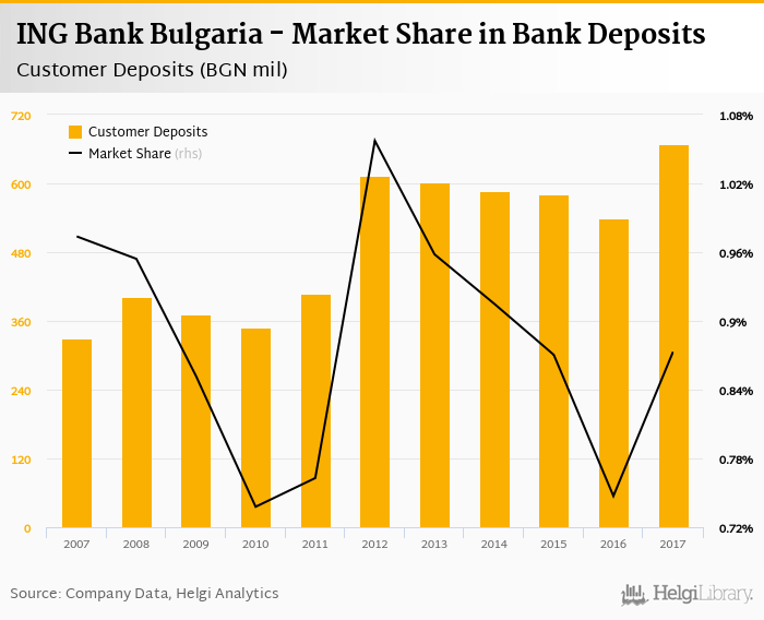 ING Bank Bulgaria accounted for 0.873% of all customer deposits taken by banks in Bulgaria at the end of 2017. Historically, the bank’s market share in customer deposits reached an all time high of 1.06% in 2012 and an all time low of 0.738% in 2010.