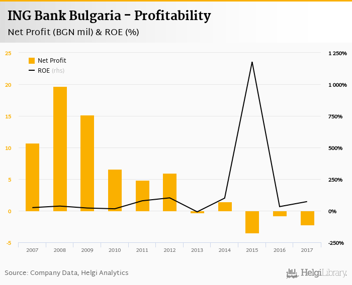 Comparing ING Bank Bulgaria with its closest peers, DSK Bank generated a net profit of BGN 285 mil with ROE of 17.7% in 2017, United Bulgarian Bank netted BGN -47.4 mil (ROE of -4.55%) and Raiffeisenbank Bulgaria announced a net profit of BGN 137 mil implying ROE of 14.9%.