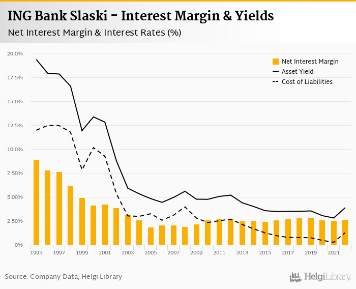 Comparing ING Bank Slaski with its closest peers, PKO BP operated in 2022 with a net interest margin of 2.69% in 2022, Pekao reached 3.10% and Santander Bank Polska some 3.84%.