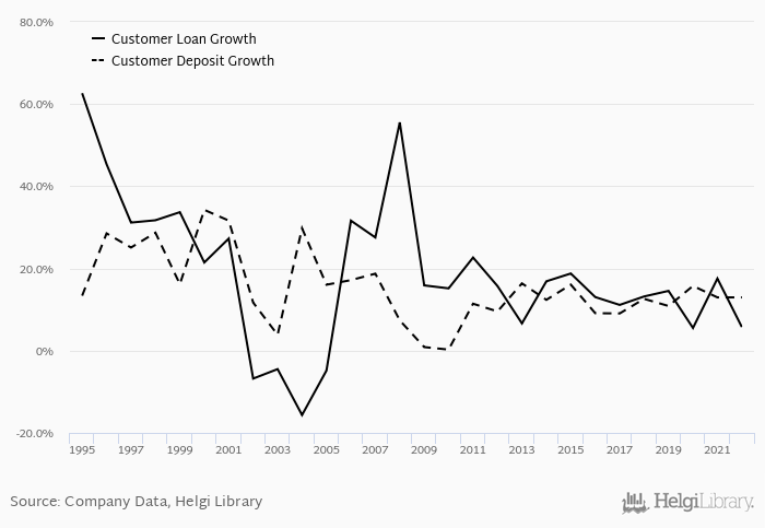 On the other hand, bank's customer deposit growth amounted to 13.0% at the end of 2022, up from 13.0% when compared to the previous year. Historically, the bank’s deposit growth reached an all time high of 34.3% in 2000 and an all time low of 0.269% in 2010. In the last decade, the average annual loan growth amounted to 12.8%.