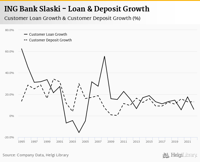 ING Bank Slaski's customer loan growth reached 5.76% in 2022, down from 17.6% compared to the previous year. Historically, the bank’s loans growth reached an all time high of 62.6% in 1995 and an all time low of -15.6% in 2004. In the last decade, the average annual loan growth amounted to 12.2%.