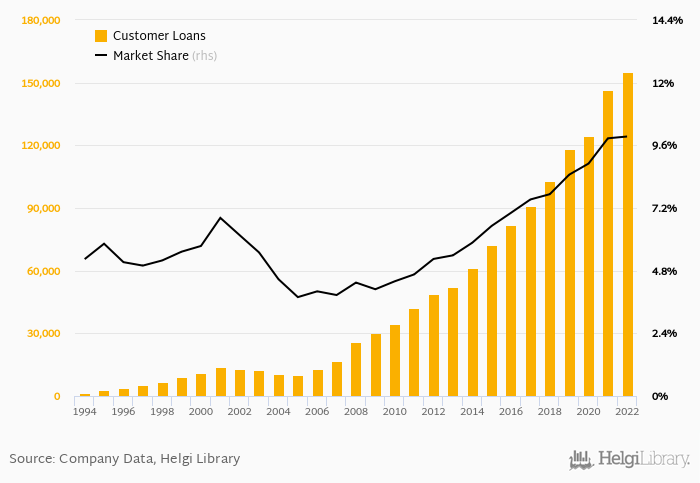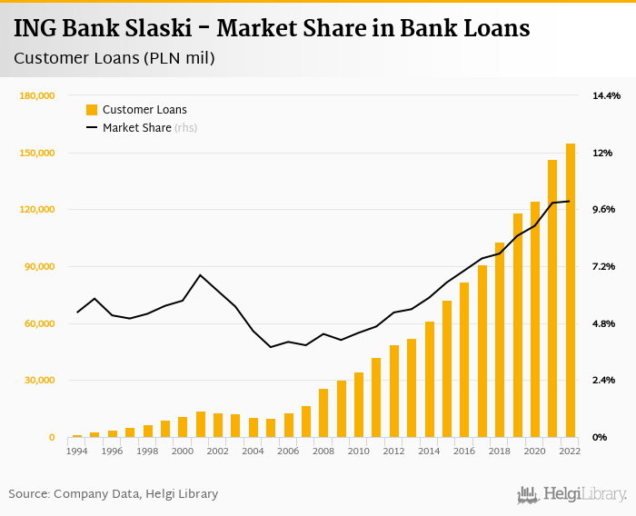 ING Bank Slaski accounted for 9.94% of all customer loans issued in Poland at the end of 2022. Historically, the bank’s market share in customer loans reached an all time high of 9.94% in 2022 and an all time low of 3.79% in 2005.