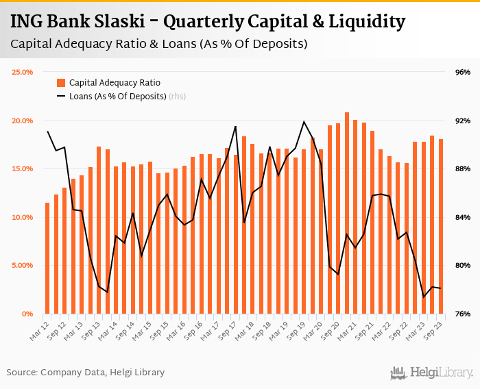 ING Bank Slaski's capital adequacy ratio reached 18.1% at the end of third quarter of 2023, down from 18.5% when compared to the previous quarter. Historically, the bank’s capital ratio hit an all time high of 20.9% in 4Q2020 and an all time low of 11.6% in 1Q2012.
