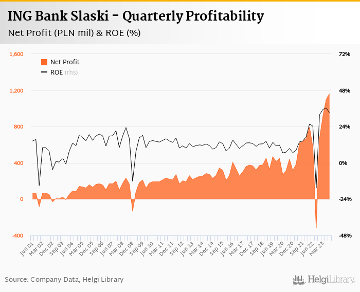 ING Bank Slaski made a net profit of PLN 1,162 mil in the third quarter of 2023, up 466% when compared to the same period of last year. This implies a return on equity of 33.0%.