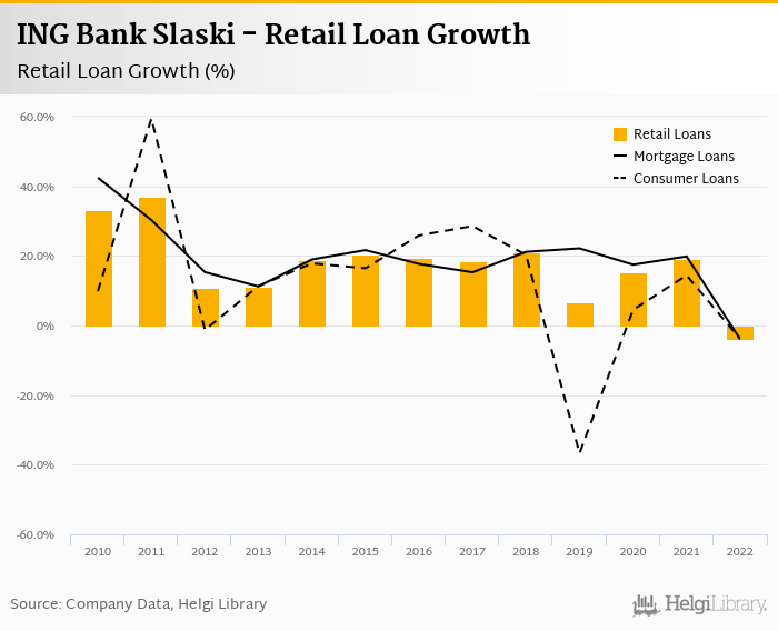 ING Bank Slaski's retail loans reached PLN 63,882 mil at the end of 2022, down 3.92% compared to the previous year. In the last decade, the average annual loan growth amounted to 14.4%.