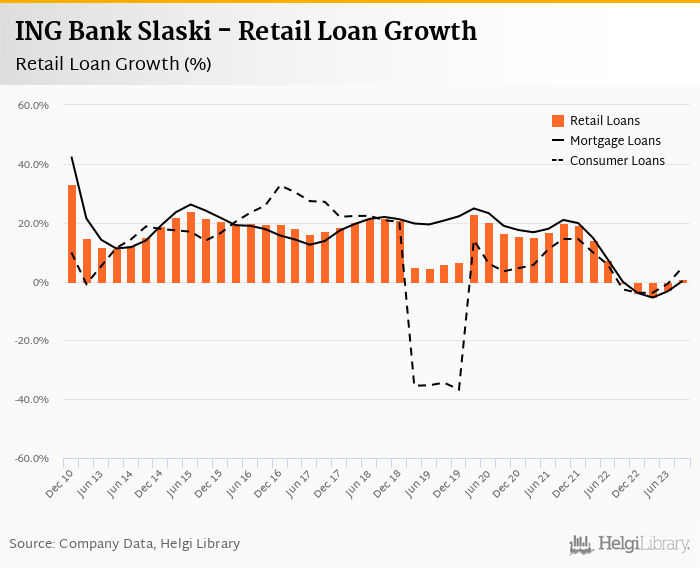 ING Bank Slaski's retail loans reached PLN 64,722 mil at the end of 2023-09-30, up 1.24% compared to the previous year. In the last decade, the average annual loan growth amounted to 0%.