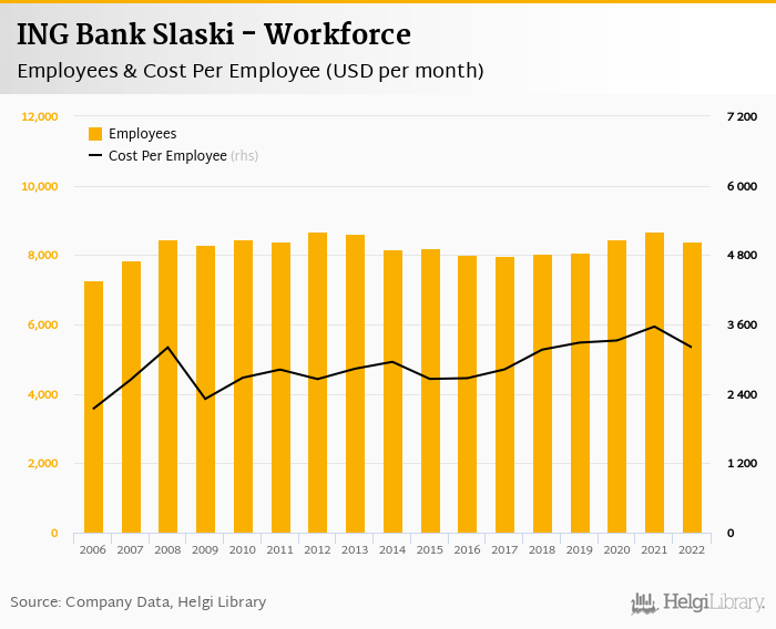 ING Bank Slaski employed 8,399 persons in 2022, down 3.39% when compared to the previous year. Historically, the bank's workforce hit an all time high of 8,694 persons in 2021 and an all time low of 7,281 in 2006.