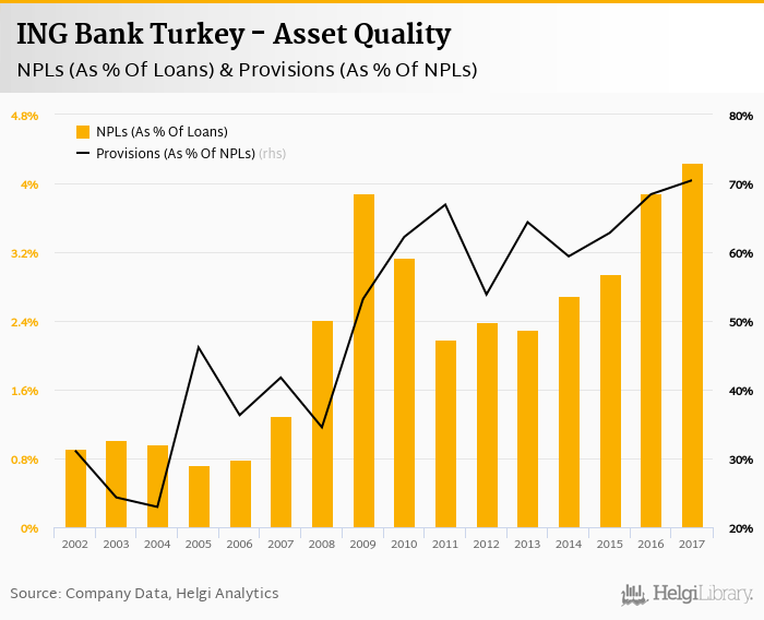 ING Bank Turkey's non-performing loans reached 4.25% of total loans at the end of 2017, up from 3.88% compared to the previous year. Historically, the NPL ratio hit an all time high of 4.25% in 2017 and an all time low of 0.725% in 2005.