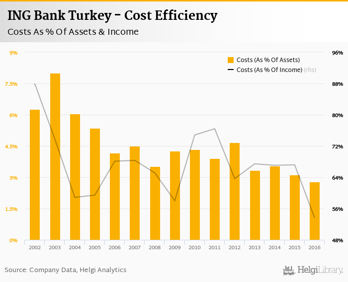 ING Bank Turkey's cost to income ratio reached 53.6% in 2016, down from 67.2% compared to the previous year.