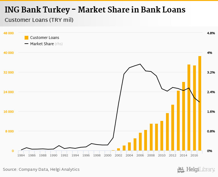ING Bank Turkey accounted for 1.97% of all customer loans issued in Turkey at the end of 2017. Historically, the bank’s market share in customer loans reached an all time high of 3.52% in 2006 and an all time low of 0.024% in 1984.