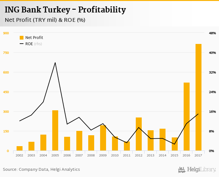 ING Bank Turkey made a net profit of TRY 817 mil in 2017, up 56.5% compared to the previous year. This implies a return on equity of 15.0%.