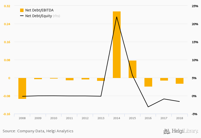 Historically, the firm’s net debt to equity reached a high of 21.9% in 2014 and a low of -3.10% in 2016 between 2008 and 2018. The average for the last five years was 4.40%.