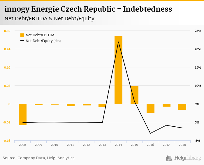 innogy Energie Czech Republic's net debt stood at CZK -71.4 mil and accounted for -1.62% of equity at the end of 2018. The ratio is down 0.727 pp compared to the previous year.