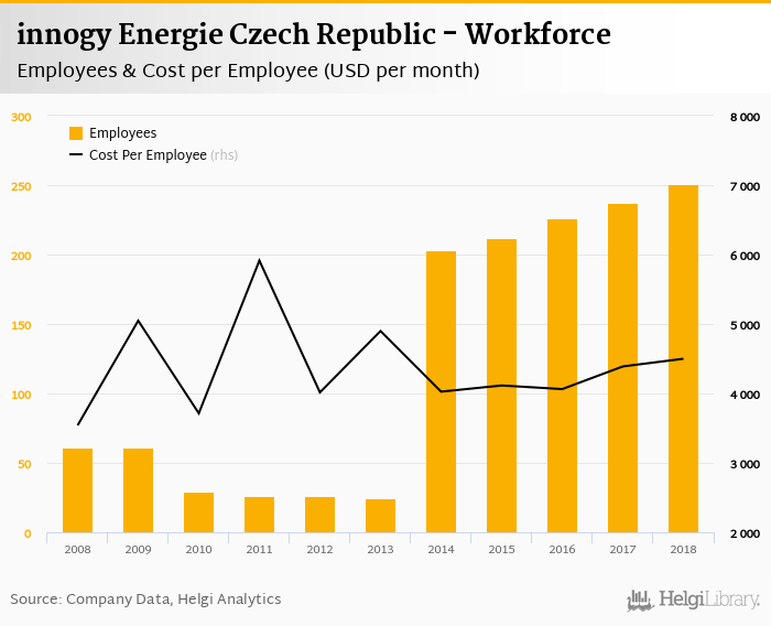 innogy Energie Czech Republic employed 251 employees in 2018, up 5.91% compared to the previous year. Historically, between 2007 and 2018, the firm's workforce hit a high of 251 employees in 2018 and a low of 25.0 employees in 2013.