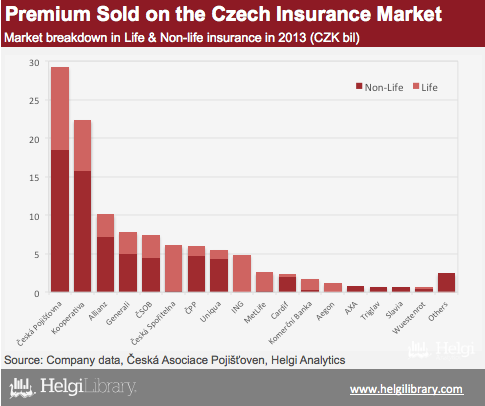 Insurance companies have sold CZK 114 bil (USD 5.6 bil) worth of premiums in 2013, according to Association Of Czech Insurers. Market incumbent Ceska Pojistovna maintains its leading position with a 25.7% share followed by Kooperative pojistovna (owned by Austria's VIG) with 19.6% share.