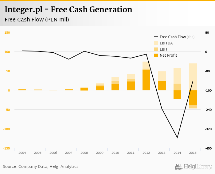 The company generated cash, defined by a sum of net profit and depreciation, of PLN 32.5 mil or 4.48% of sales. When investments are excluded, free cash flow reached PLN -124 mil, or -17.0% of sales in 2015.