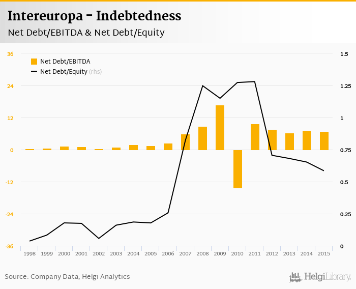 Intereuropa's net debt stood at EUR 86.6 mil and accounted for 0.585 of equity at the end of 2015. The ratio is down 0.068 pp compared to the previous year.