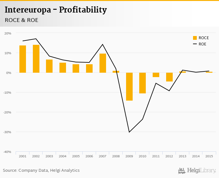 Intereuropa made a net profit of EUR 1.05 mil in 2015, up 636% compared to the previous year. Historically, between 1998 and 2015, the company's net profit reached a high of EUR 26.1 mil in 2007 and a low of EUR -54.2 mil in 2009.